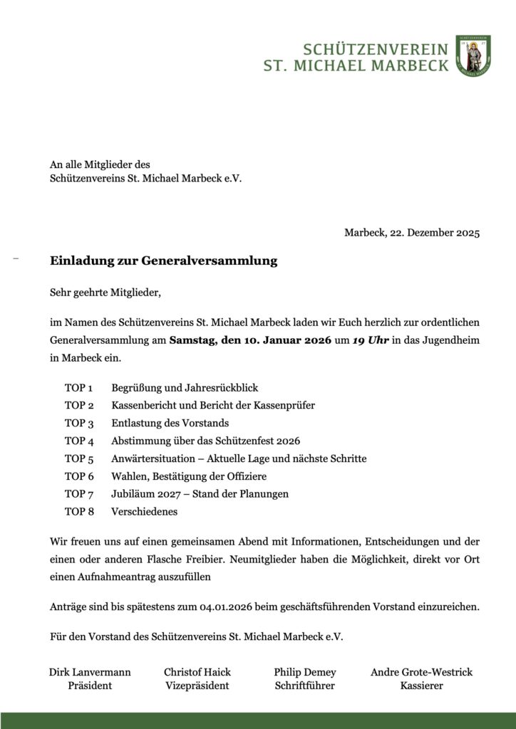 Sehr geehrte Schützen, wir laden zur Generalversammlung am Samstag, den 10. Januar um 19 Uhr im Jugendheim Marbeck ein.