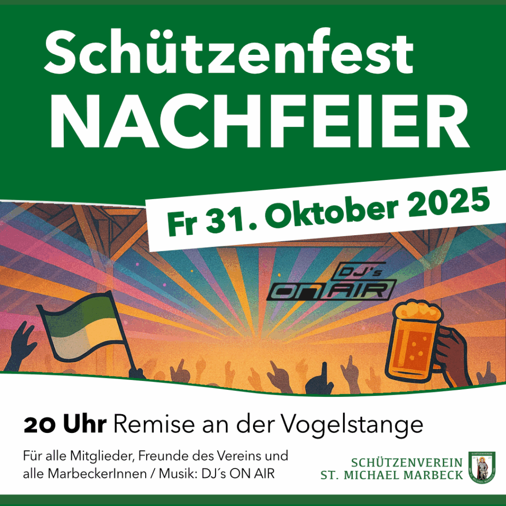 Am Freitag, 31. Oktober 2025, laden wir alle Mitglieder mit Partnerin, Marbeckerinnen und Freunde unseres Vereins herzlich zur Schützenfest-Nachfeier ein.