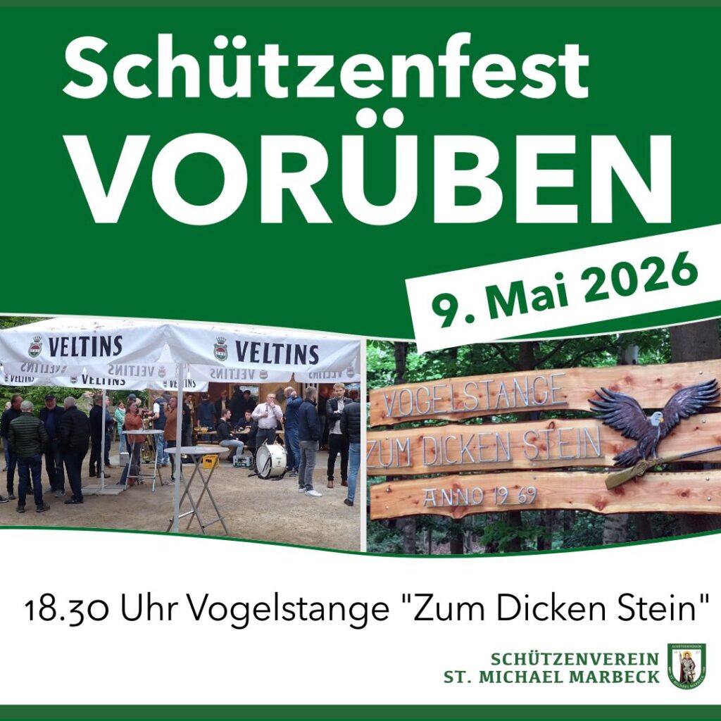 Am Samstag, 9. Mai 2026 starten wir gemeinsam in die heiße Phase vor unserem Schützenfest. Ab 18.30 Uhr treffen wir uns an der Vogelstange „Zum Dicken Stein“.