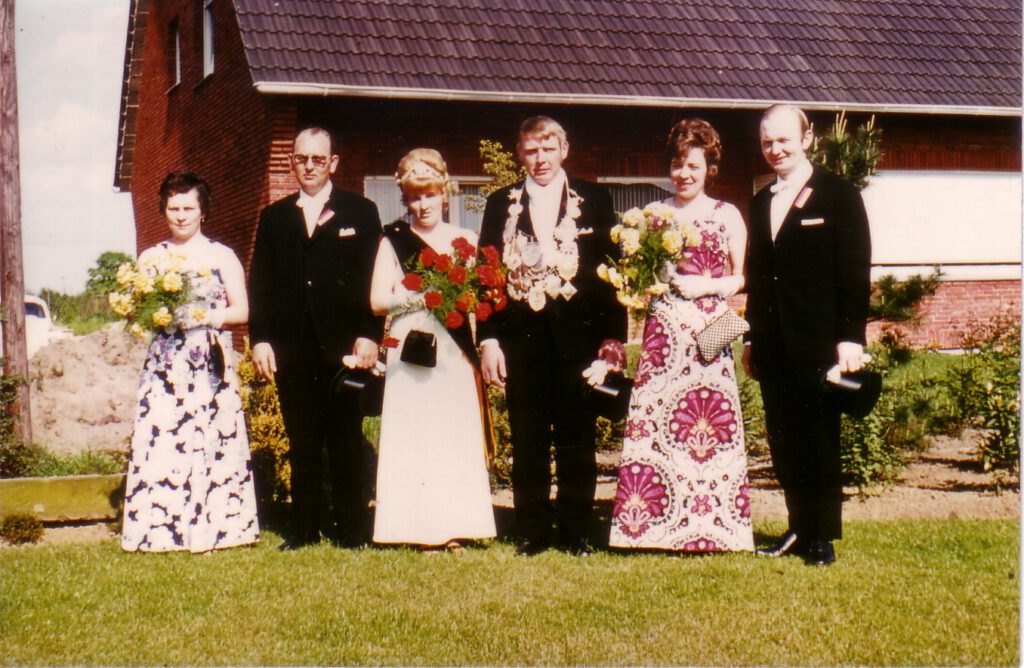 Throngemeinschaft 1971 Von links nach rechts: Mia Kampschroer, Georg Haick, Königin Marlies Höing, König Josef Kaß, Renate Föcking, Franz Nienhoff
